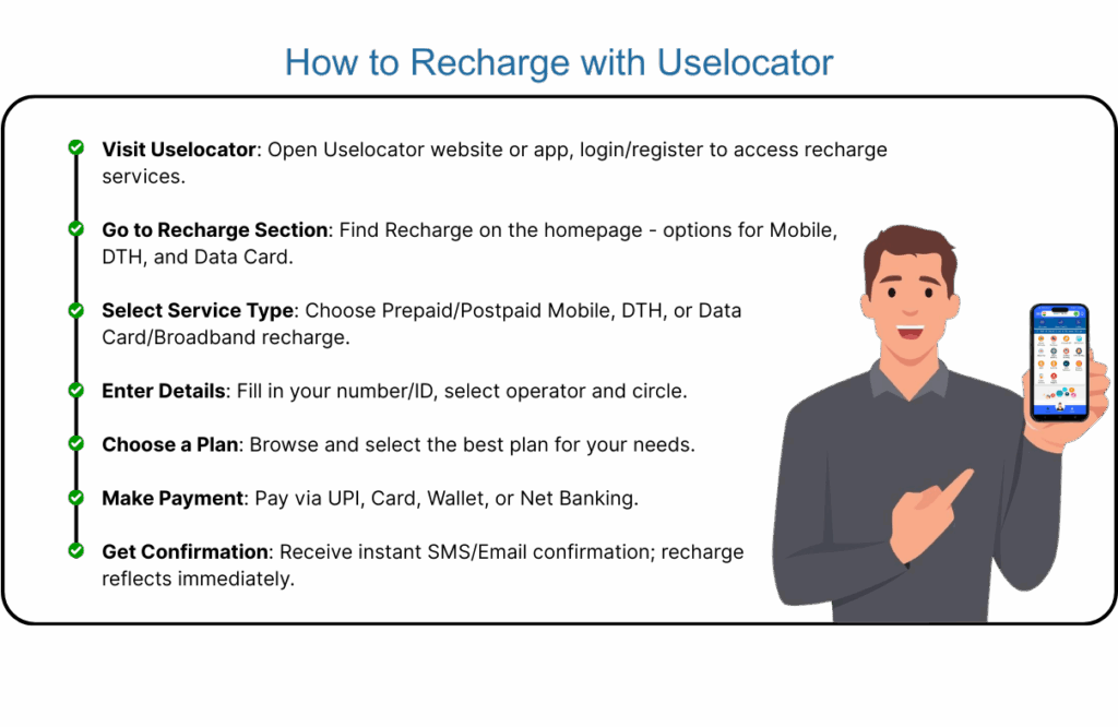 Staying connected in today’s world should be effortless. With Uselocator Recharge Services, you can recharge your mobile, DTH, or data card in just a few clicks. No queues, no delays—just instant, secure, and hassle-free transactions right from your phone or desktop.